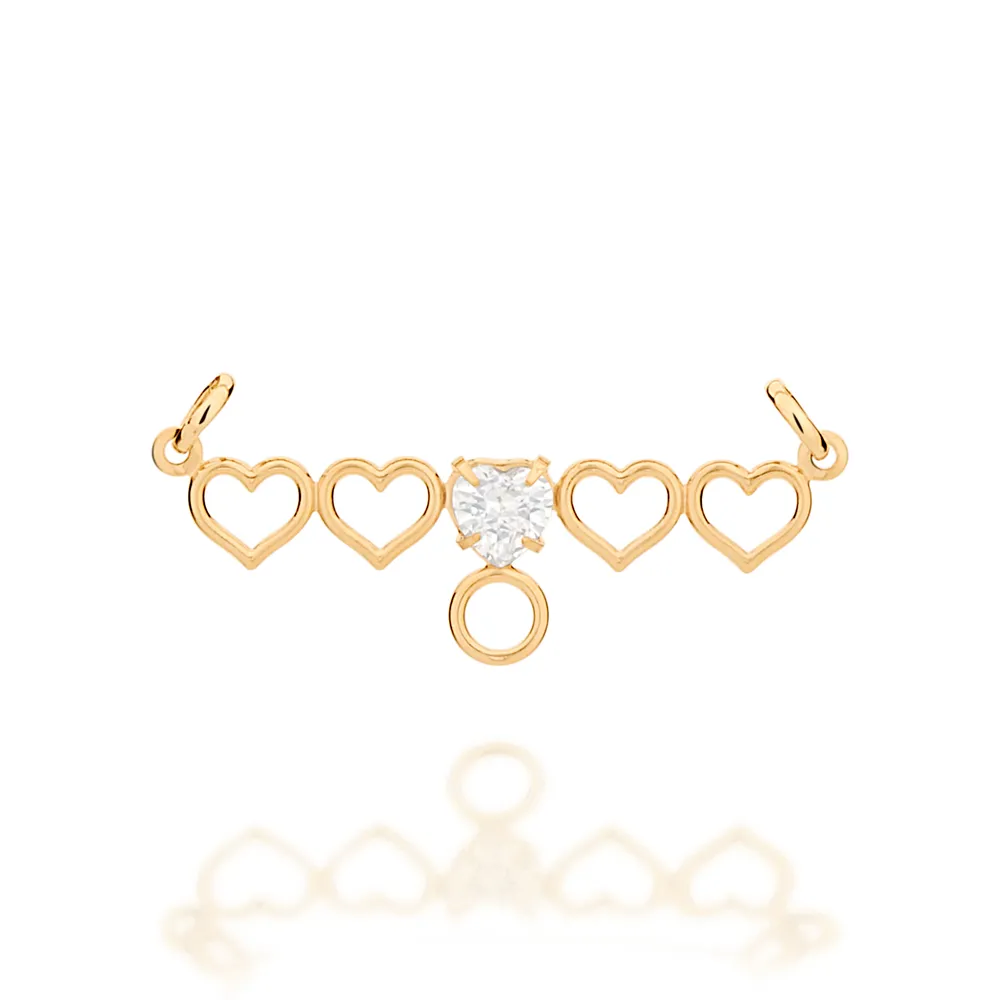 Pingente Rommanel dourado canga separador com cinco corações vazados dispostos lado a lado, sendo o central com pedra de zirconia em formato de coração de 6x6 mm. 542389